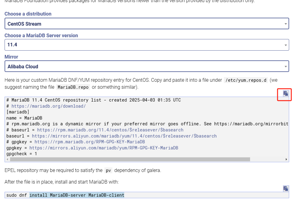 基于YUM的Linux发行版的YUM源,使用在线的源生成器可以轻松地为你的发行版生成正确的MariaDB.repo,